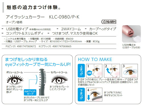 KOIZUMI KLC-0980 コイズミ アイラッシュカーラー 【製品仕様】 品番 KLC-0980 [KLC0980] 本体寸法 約 16(W)×17(D)×154(H)mm(キャップ装着時) 質量 約 30g(キャップ装着時) 電池 使用電池ニッケル水素充電池 充電時間約10時間 持続時間約60分 付属品 USBケーブル、キャップ、取扱説明書(保証書付) 特徴 魅惑の迫力まつげ体験。